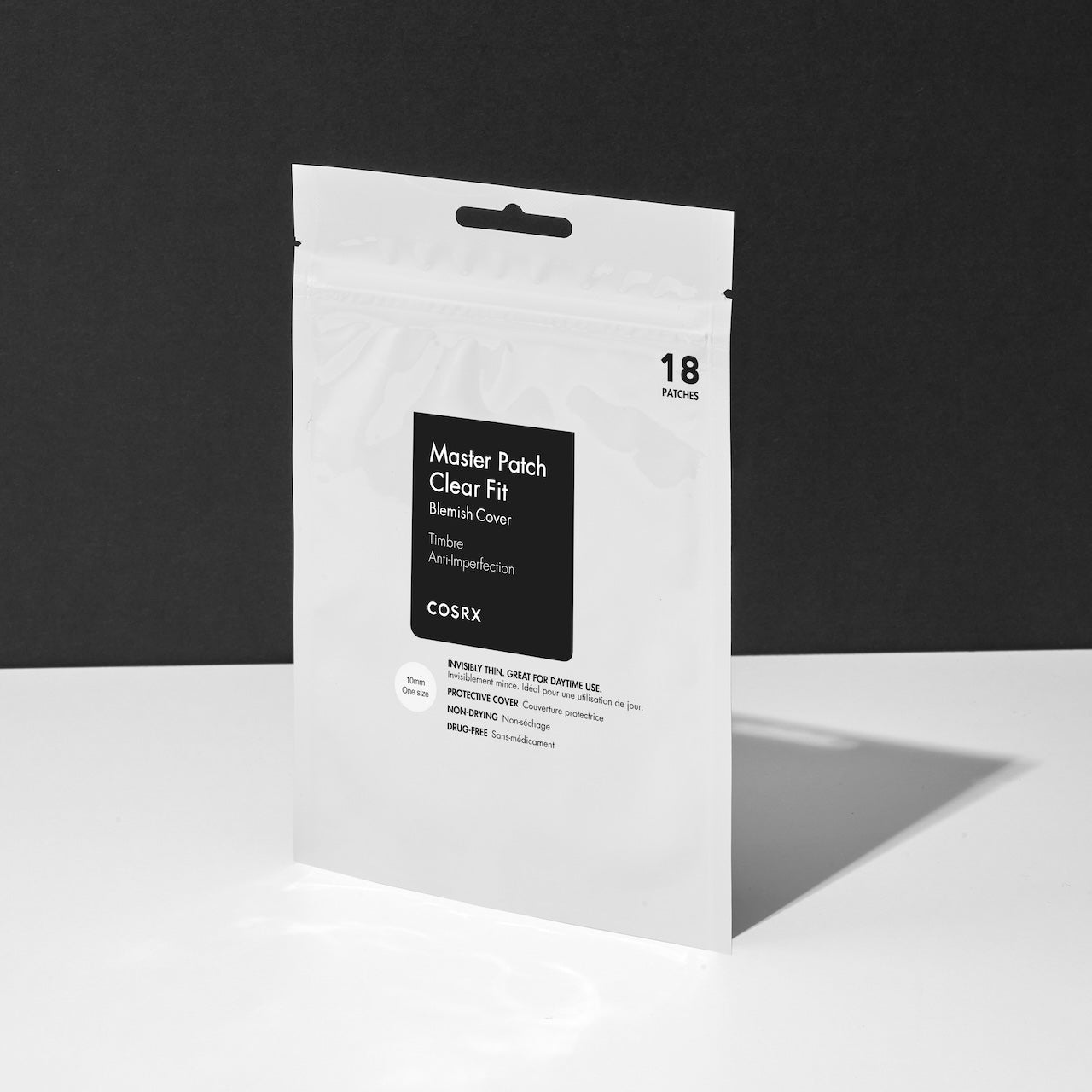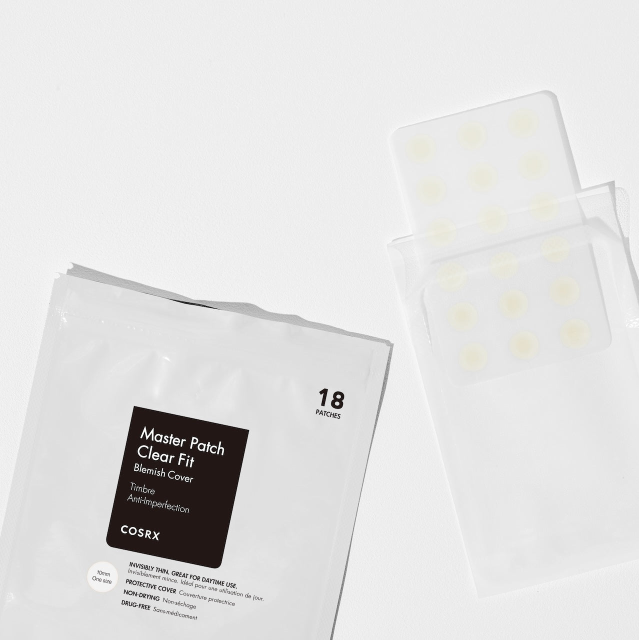 Clear Fit Master Patch hefur mjúka áferð sem er mjög þunn og mött, þannig að hún verður nánast ósýnileg á húðinni, sérstaklega þegar farði er borinn yfir.